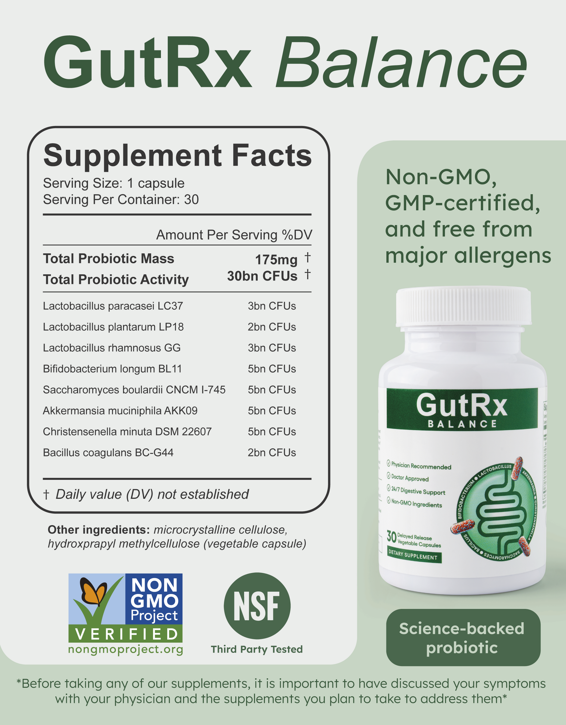 GutRx Balance contains advanced probiotics for women, bringing digestive support in a way that makes sense for your lifestyle. It features a concentrated mix of well researched adult probiotics strains, including Lactobacillus rhamnosus GG, Lactobacillus paracasei, Lactobacillus plantarum, and Bifidobacterium longum strains. This powerful microbiome works together to assist your gut in achieving a smoother flow. That means you're getting billions of living microorganisms that can actually help!
